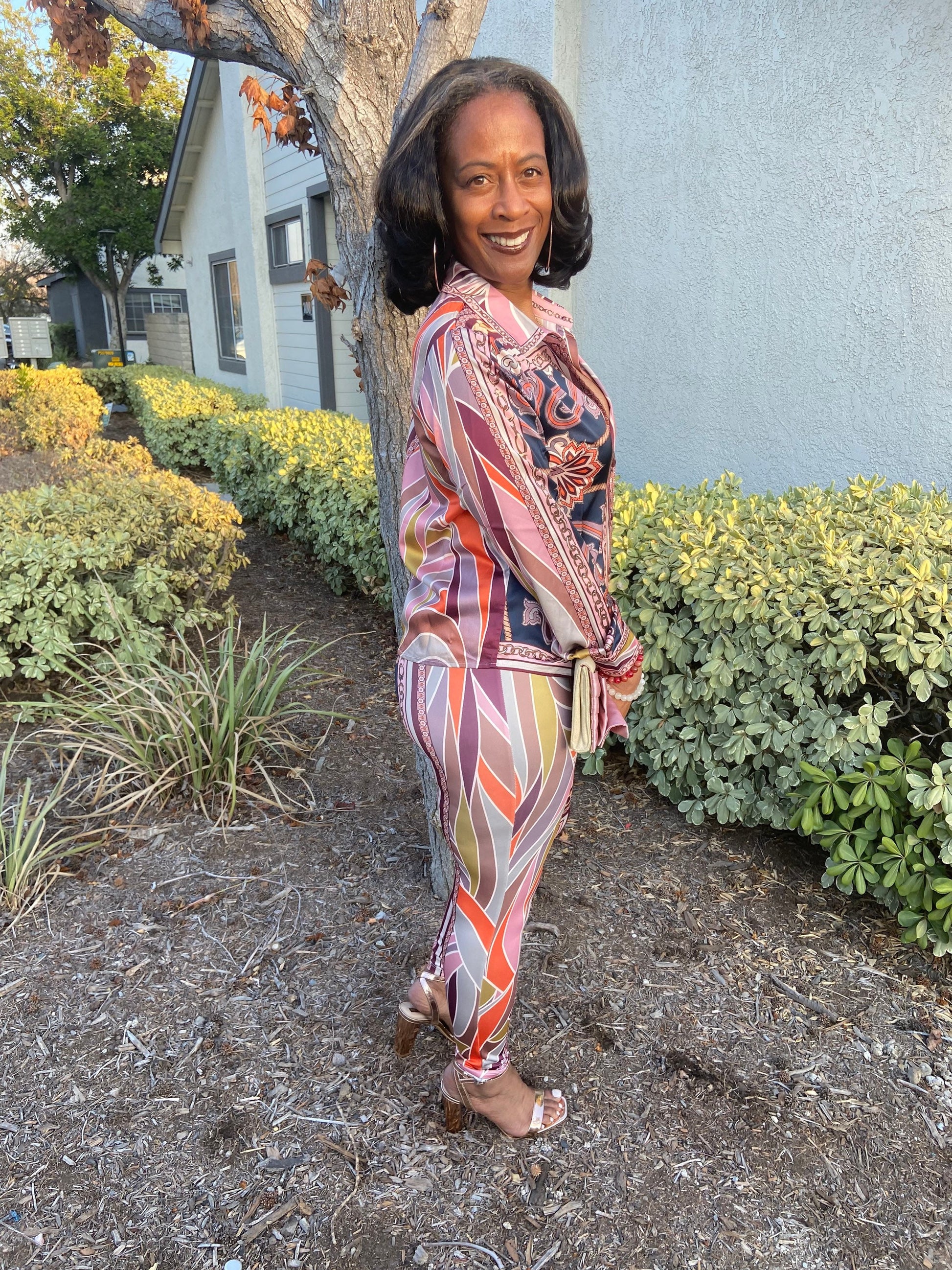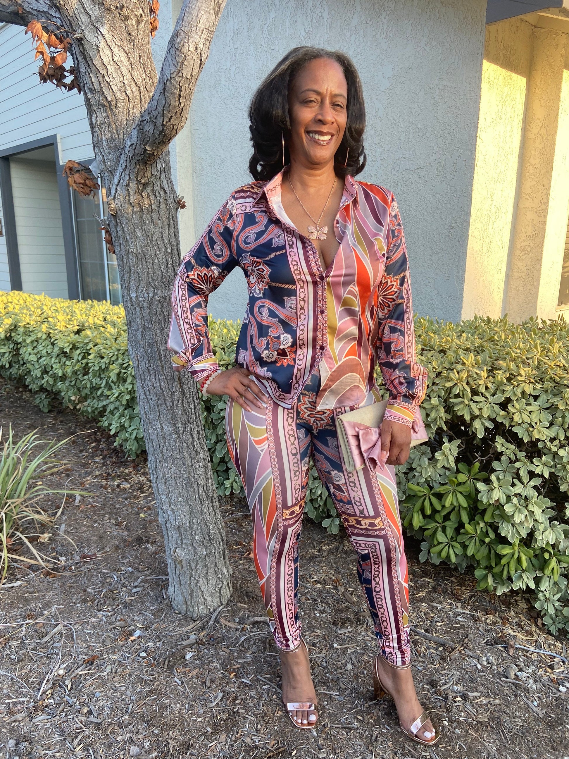 This set is sooooo cute!!! It comes with high waisted leggings and bottom down blouse with collar and cuffs. It has a nice stretch and fit. I paired it with rose gold accessories for the perfect match up.