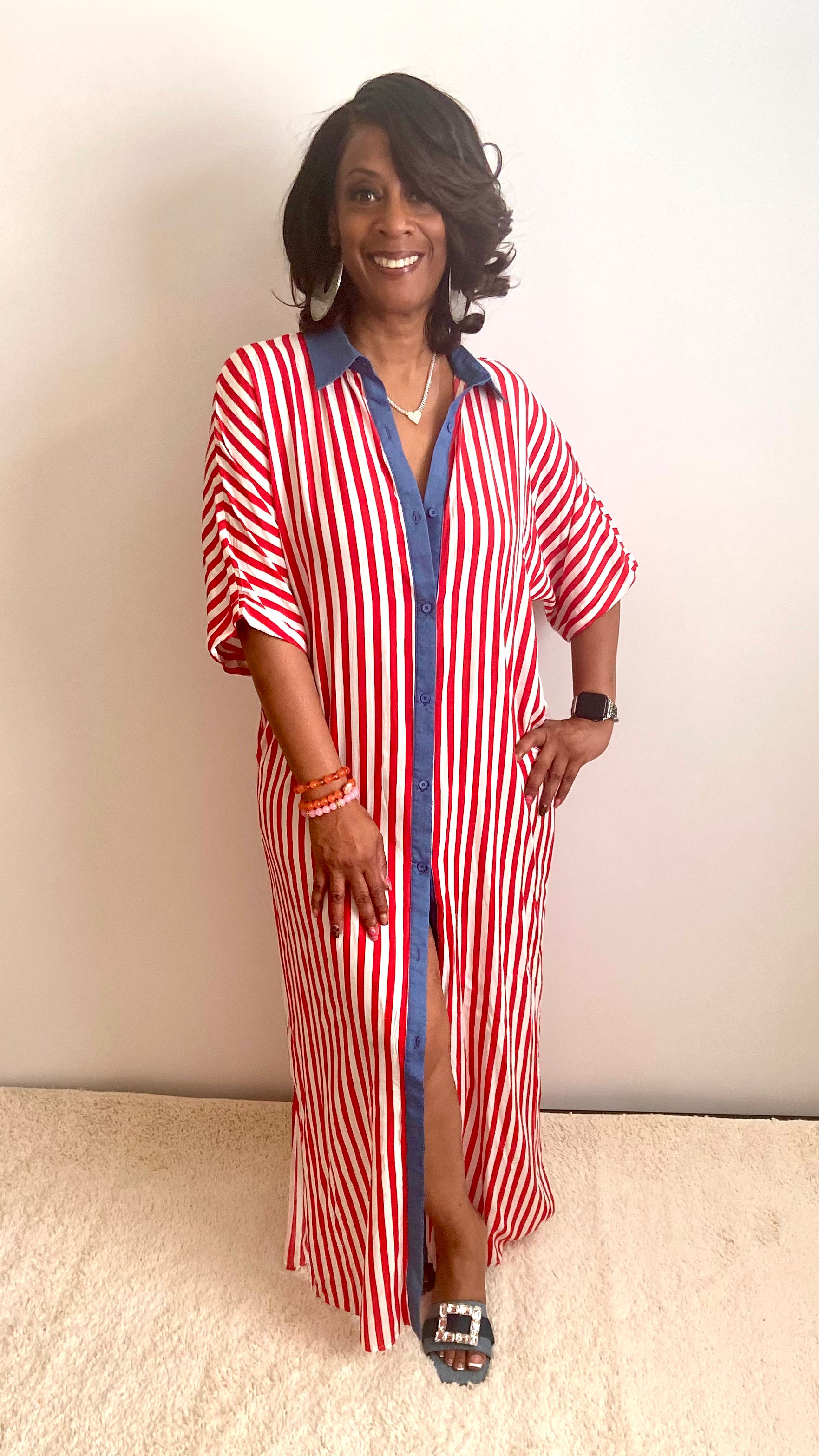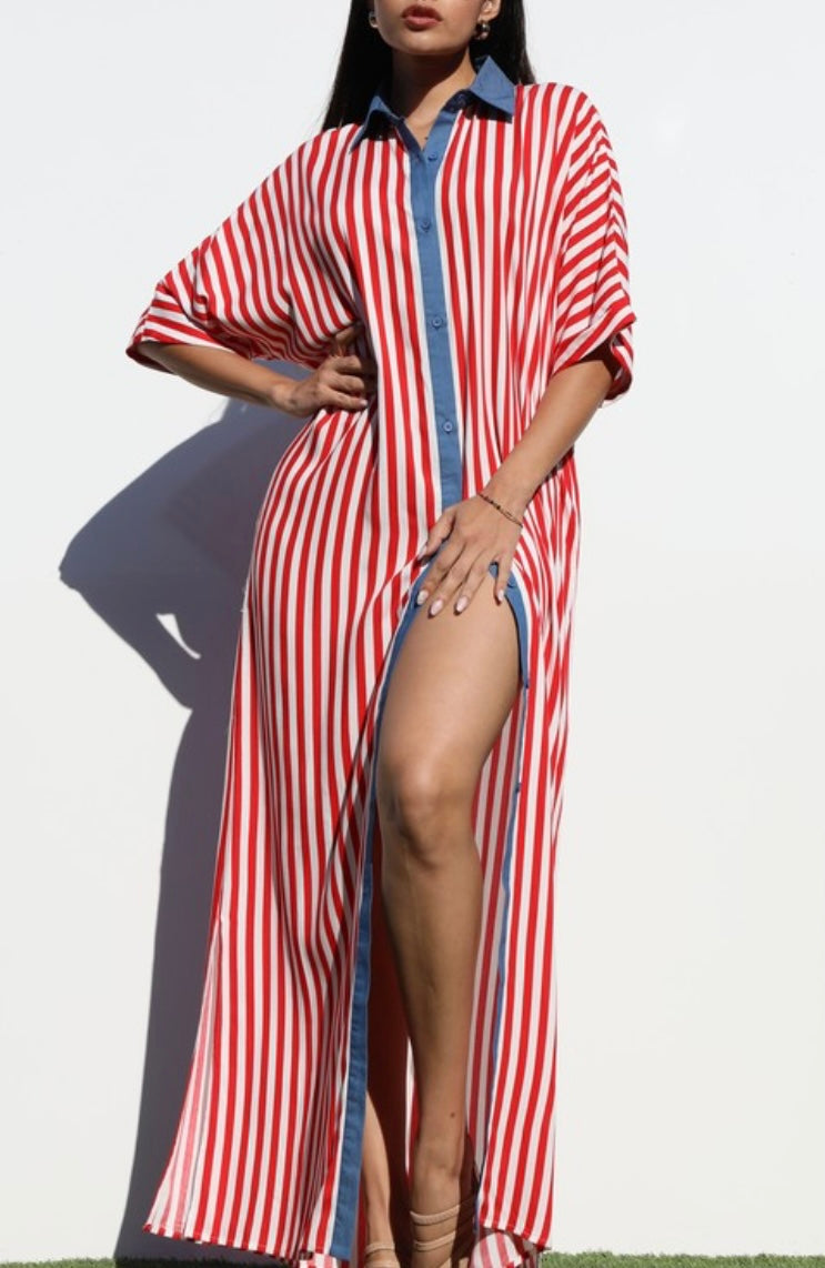A stylish red and white striped shirt dress featuring a classic button-down front. The dress has a modern twist with a denim-look collar and lapels, giving it a cool, casual edge. The stripes offer a timeless, playful pattern, while the structured collar and lapels in denim provide a sharp contrast, adding a touch of sophistication. The silhouette is relaxed yet flattering, perfect for both casual and semi-formal occasions. It pairs easily with sandals, sneakers, or even boots for a versatile, fashionable look.