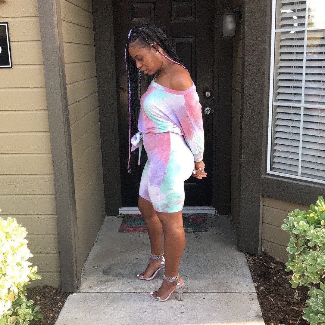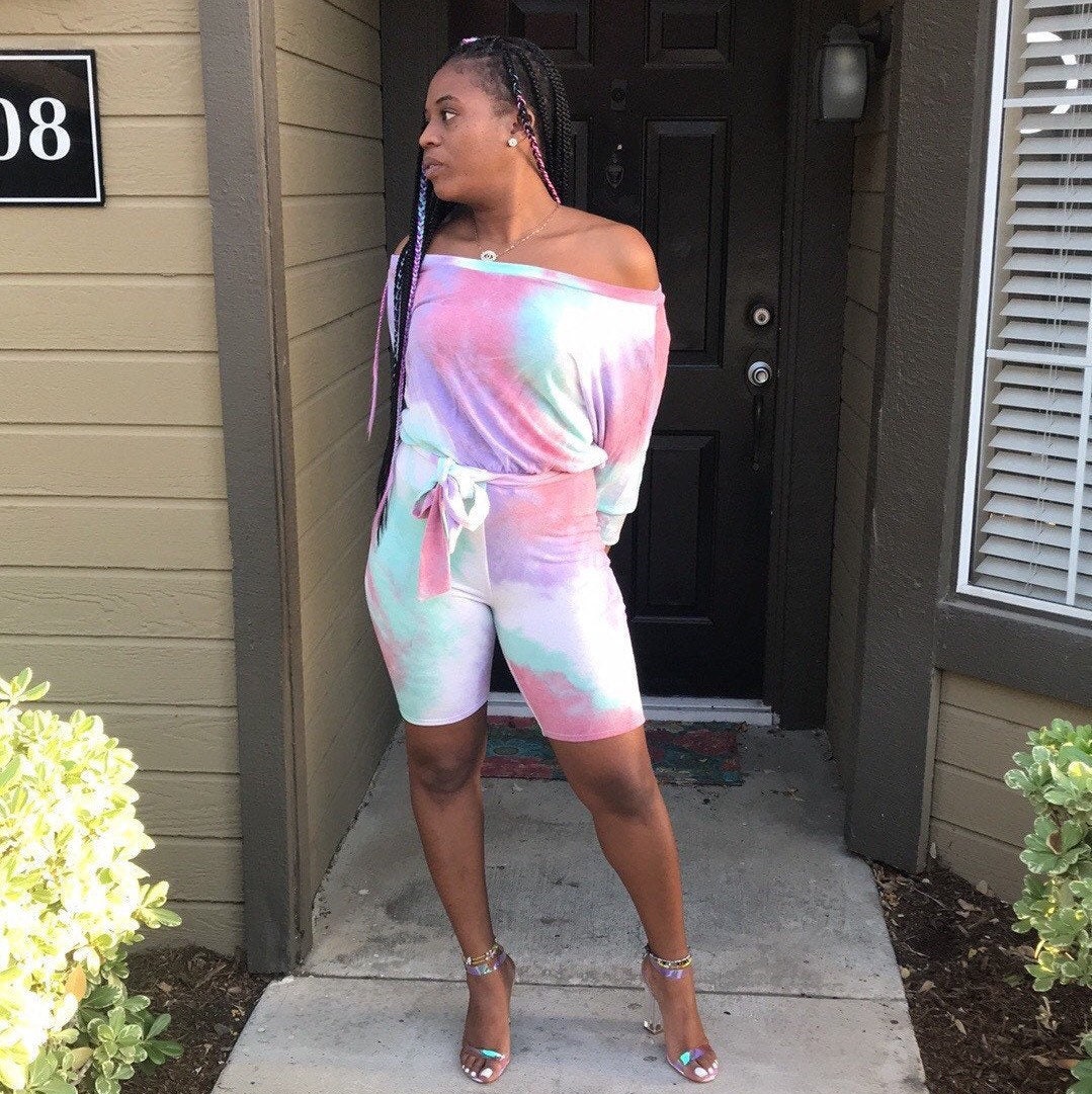Tye dyed Romper with tie. off the shoulder with biker shirt bottom. Made of 95% Polyester 5% Spandex. Semi Stretch