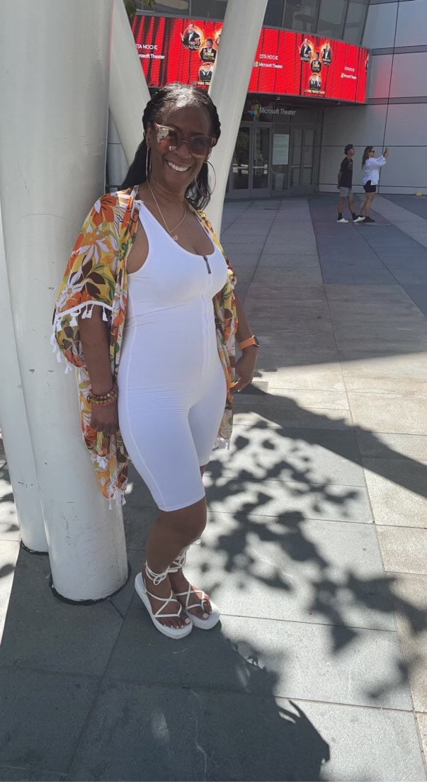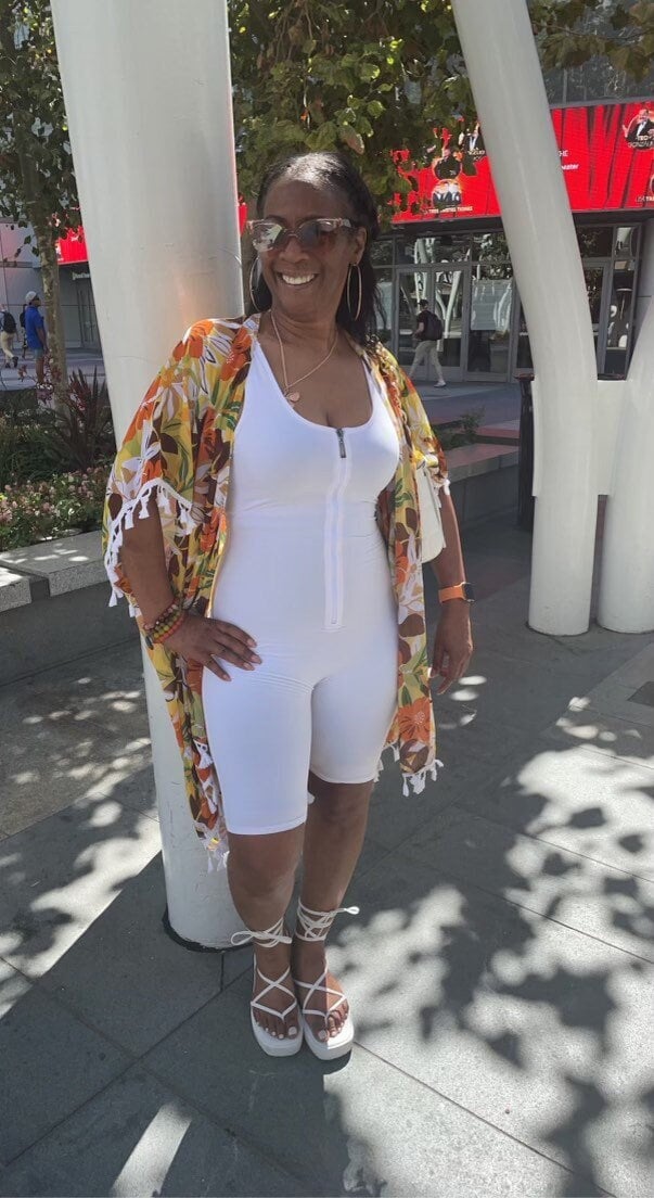 Features a white front zipper and scoop neckline with the biker shirt bottom and stretchy seamless material.